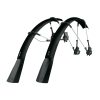SKS Raceblade Pro XL Stealth Series Mudguard Set When the weather takes a turn for the worse; don’t just endure the grime; grit and water of the road flicking up on your face; frame and backside. The SKS Raceblade Pro XL Stealth Series Mudguard Set has been designed to take on the wet weather thanks to their design; which can be used with tyres from 25-32 millimetres in width. A rubber quick release fitting system makes securing the mudguards a quick and simple job. The length of the stays can be fully adjusted to adapt to the radius of the wheel and super light; extra-long mud flaps give that extra spray protection you yearn for when the rain starts to get heavier. The SKS Raceblade Pro XL Stealth also includes an adhesive protection kit to avoid damaging the frame’s paintwork. You do not need mudguard eyelets to attach these mudguards as they attach via a rubber strap to your frame.